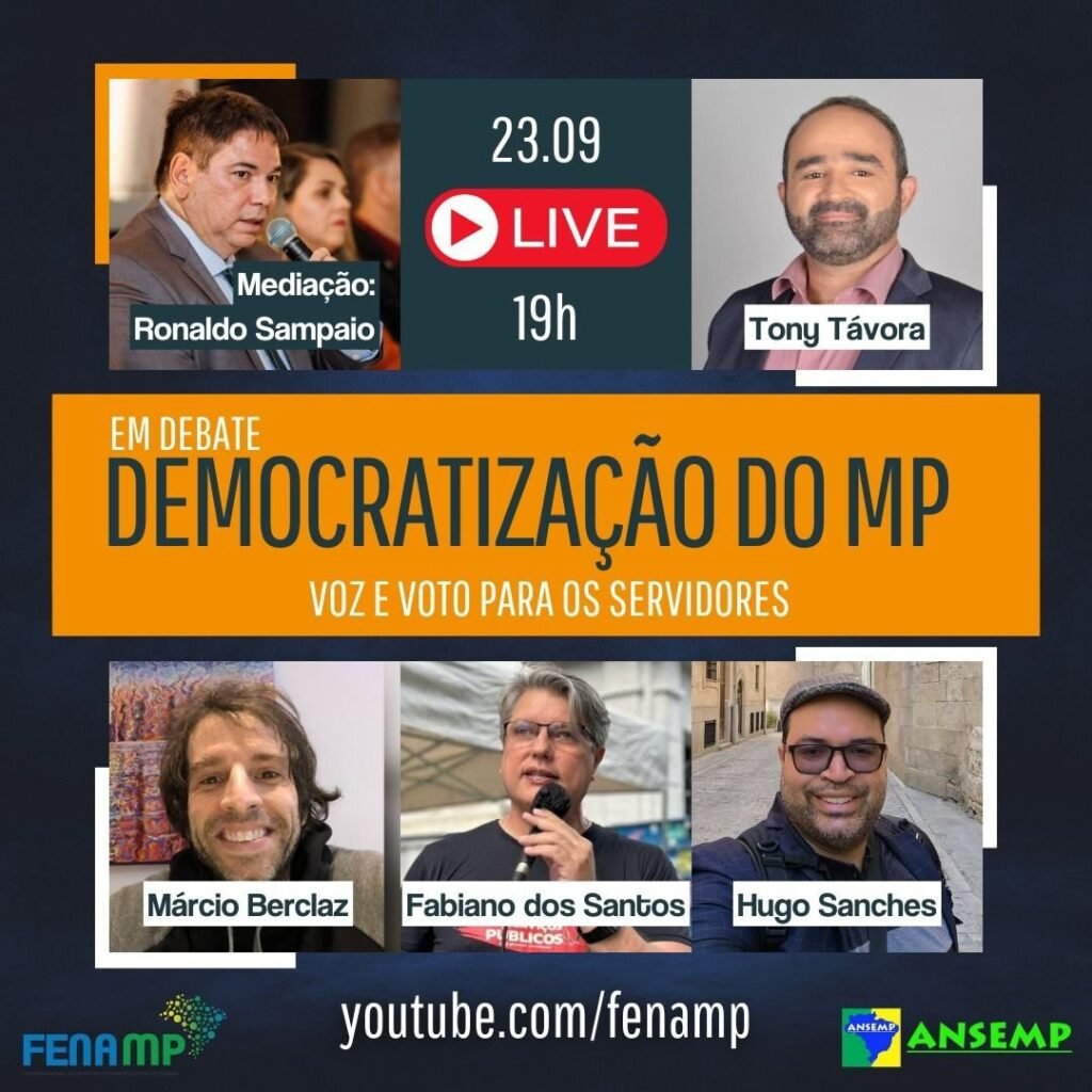 🗓 *Segunda-feira, 23 de setembro, às 19h*, a *FENAMP* e a *ANSEMP* promovem uma live para discutir a *Democratização do MP*.