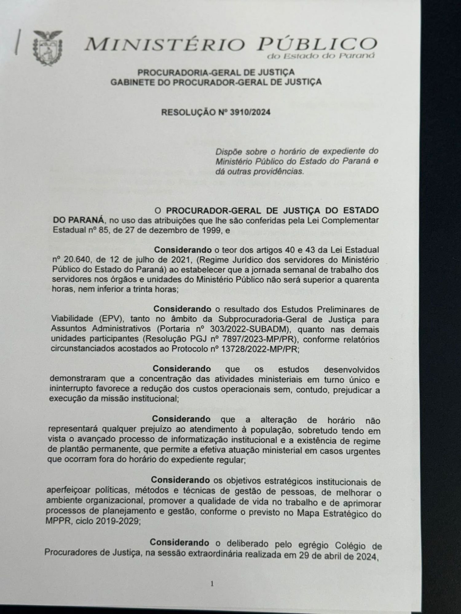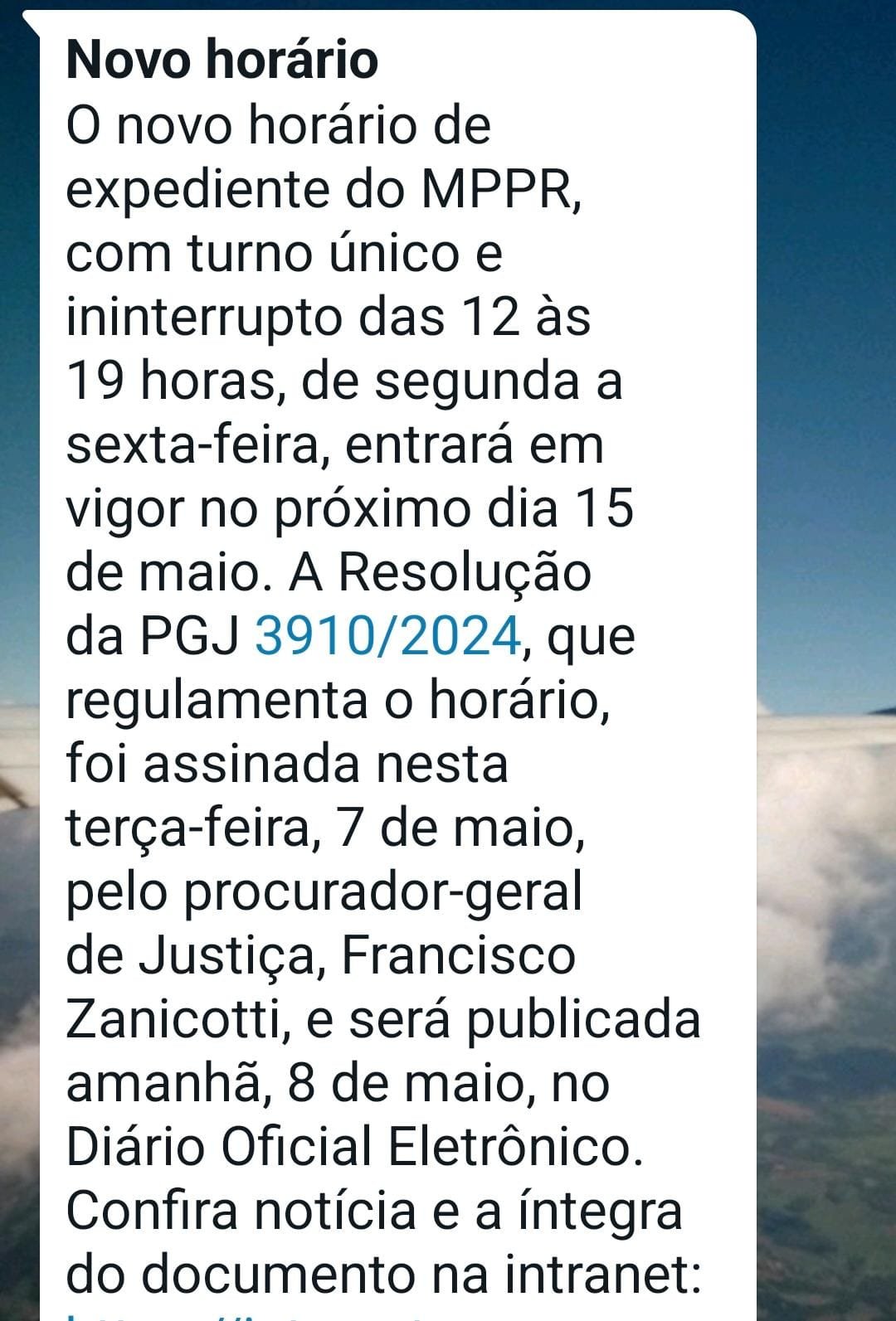 Confira notícia e a íntegra do documento na intranet: https://intranet.mppr.mp.br/Noticia/Resolucao-que-estabelece-novo-horario-sera-publicada-nesta-quarta-no-Diario-Oficial