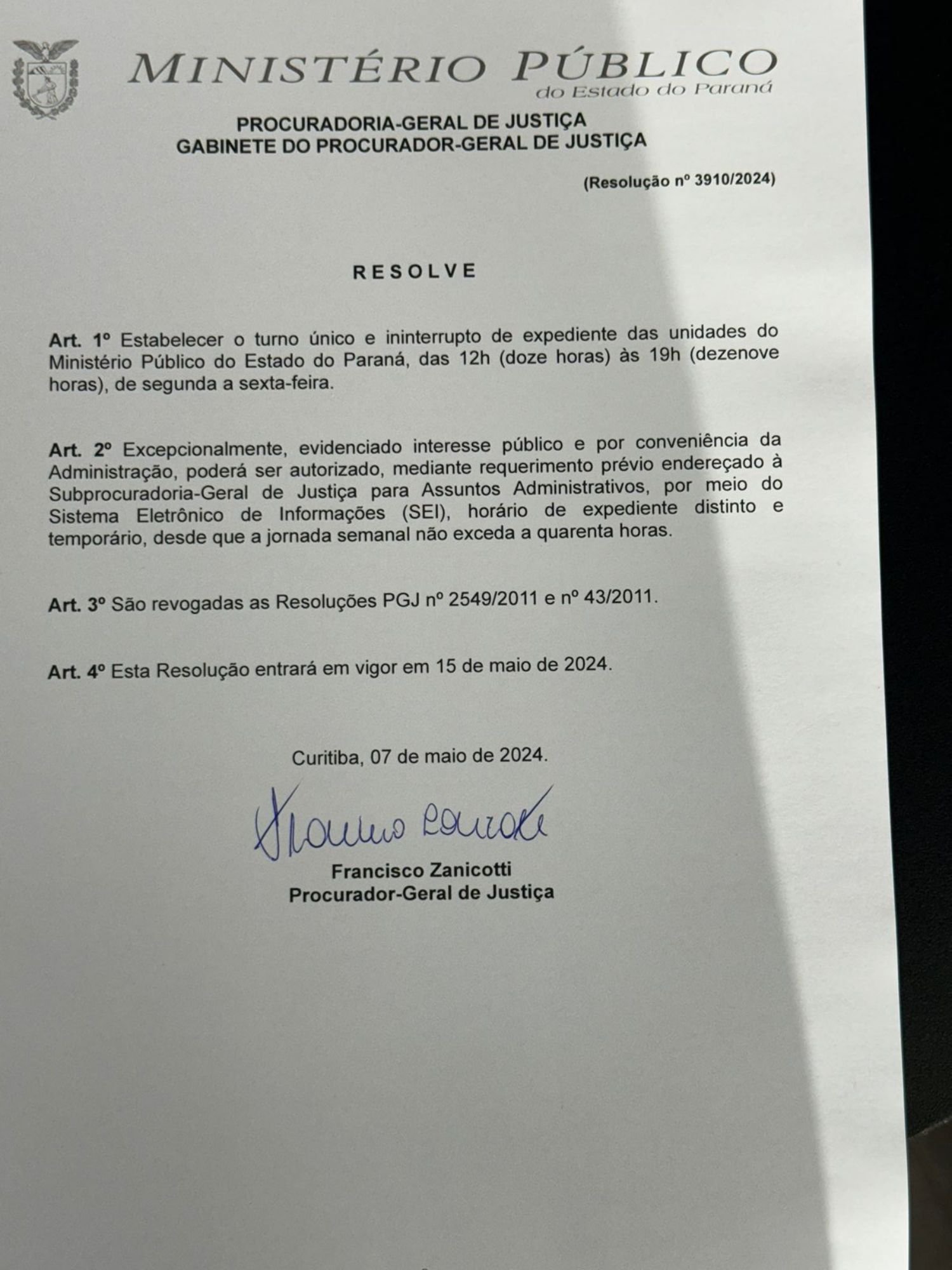 O novo horário de expediente do MPPR, com turno único e ininterrupto das 12 às 19 horas, de segunda a sexta-feira, entrará em vigor no próximo dia 15 de maio. A Resolução da PGJ 3910/2024, que regulamenta o horário, foi assinada nesta terça-feira, 7 de maio, pelo procurador-geral de Justiça, Francisco Zanicotti, e será publicada amanhã, 8 de maio, no Diário Oficial Eletrônico.