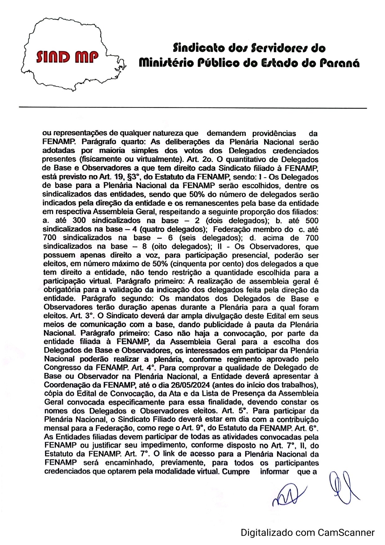13:30h – 16:00h: Plenária Nacional Ordinária da FENAMP (itens 3 a 6)