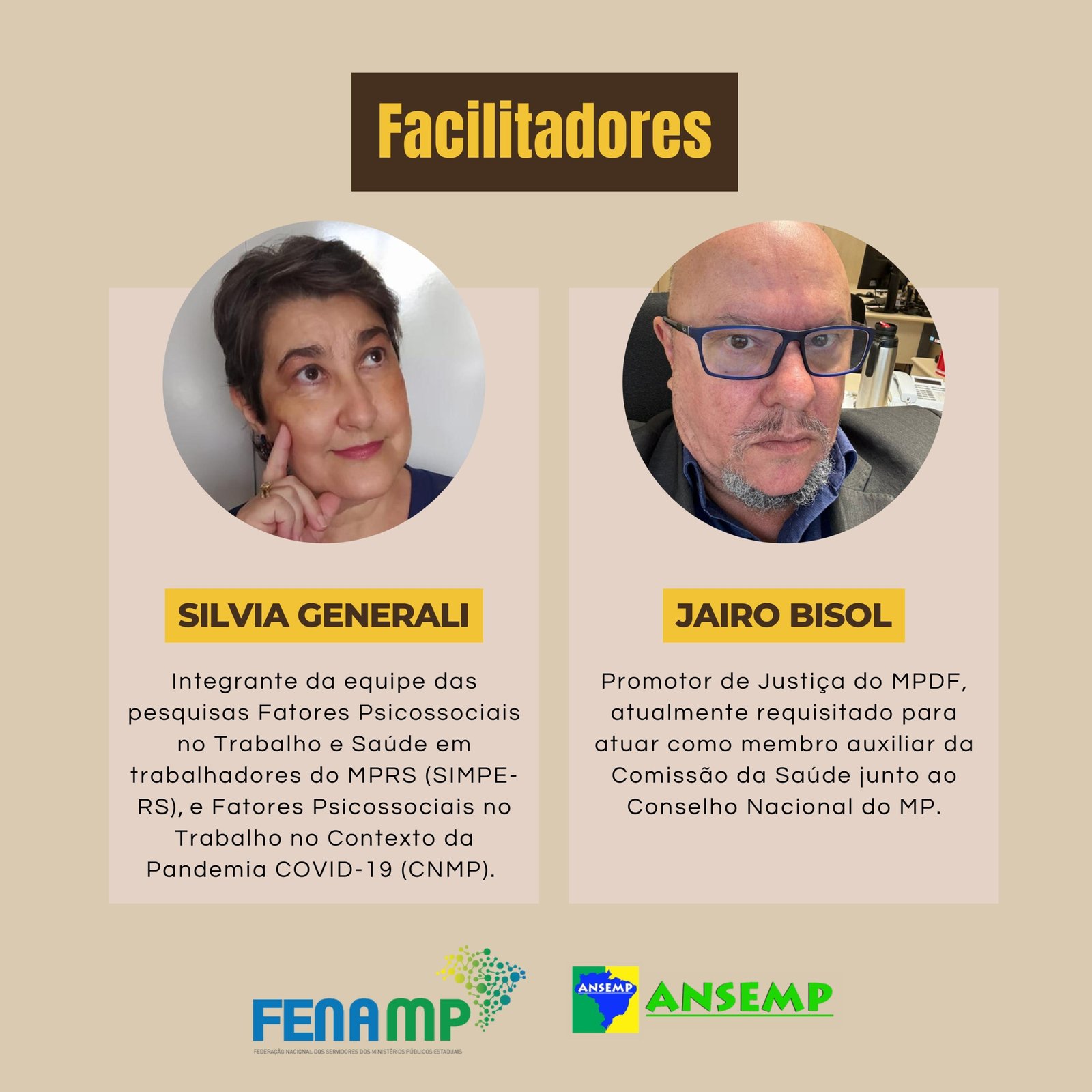 🗓 O curso acontece nos dias 11, 12 e 13 de novembro, das 19h às 20h e terá como facilitadores Silvia Generali da Costa, professora aposentada da UFRGS e integrante da equipe das pesquisas “Fatores Psicossociais no Trabalho e Saúde em trabalhadores do MPRS” (SIMPE-RS), e “Fatores Psicossociais no Trabalho no Contexto da Pandemia COVID-19” (CNMP); e Jairo Bisol, promotor de Justiça do MPDF, atualmente requisitado para atuar como membro auxiliar da Comissão da Saúde junto ao Conselho Nacional do MP.