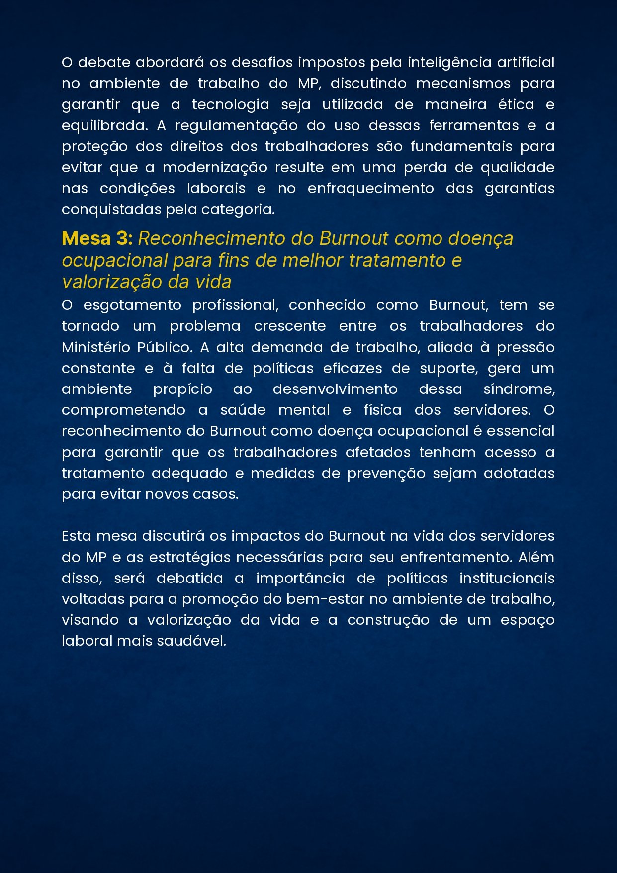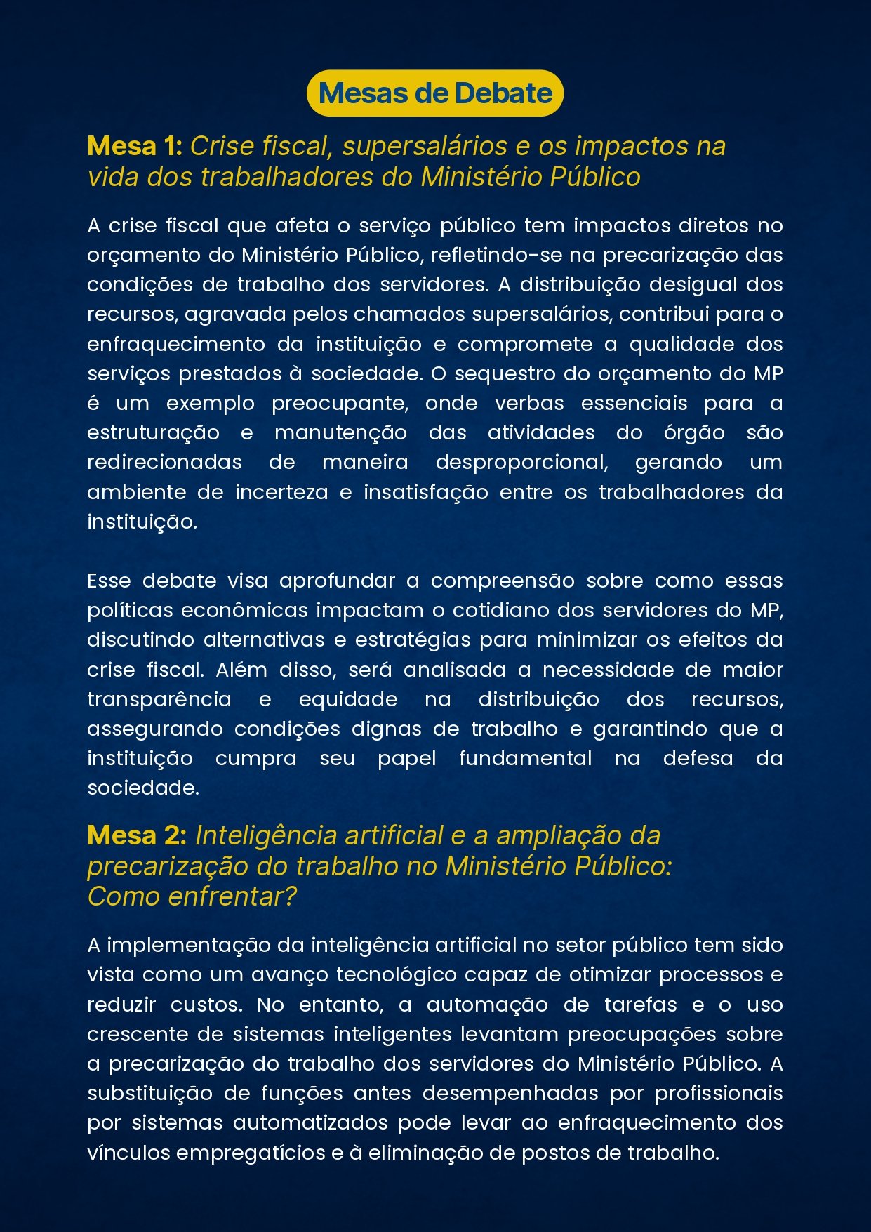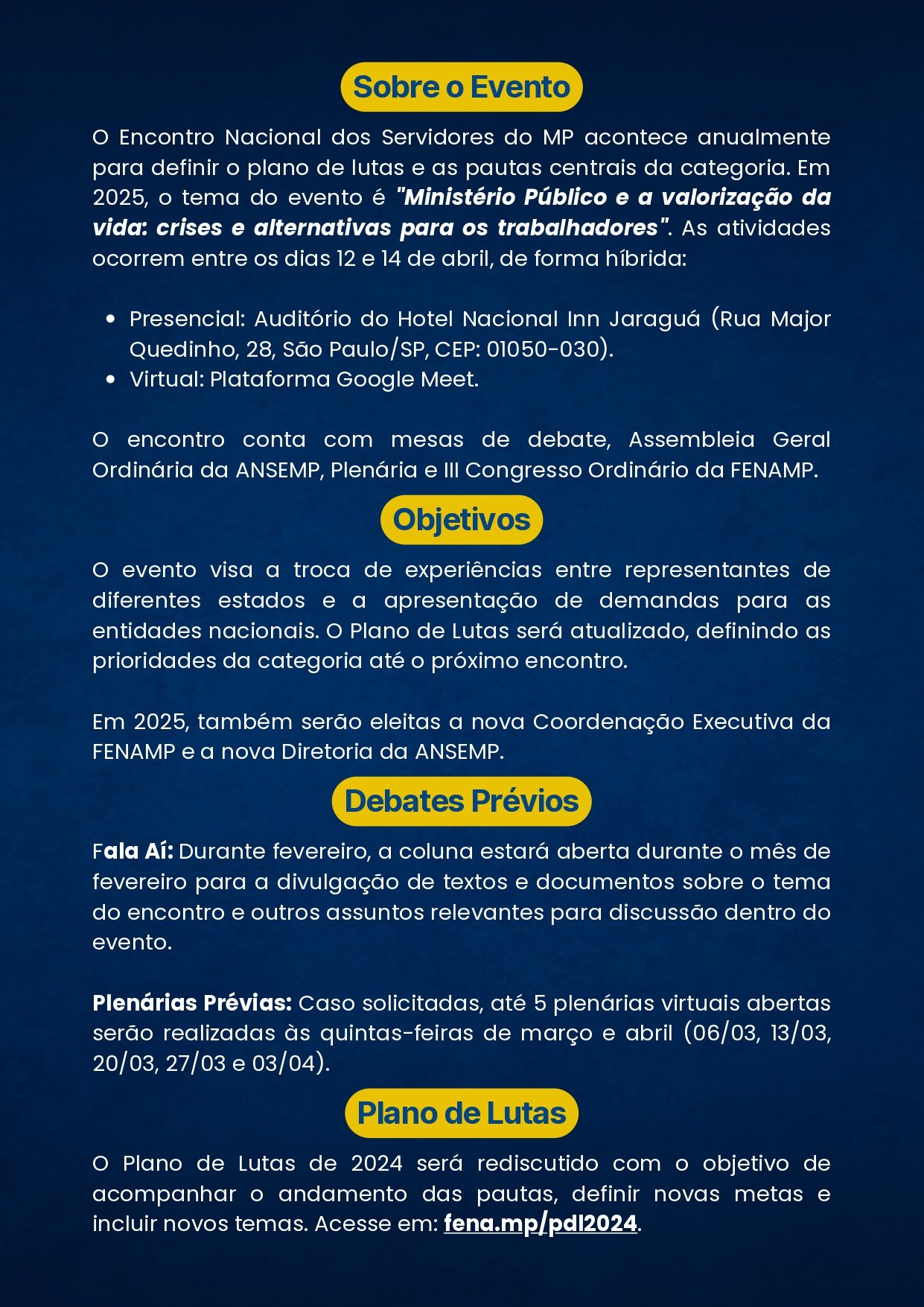 O SIND MP – SINDICATO DOS SERVIDORES DO MINISTÉRIO PÚBLICO DO ESTADO DO PARANÁ, através de sua Presidente, no uso das atribuições que lhe confere o Estatuto CONVOCA os Servidores do Ministério Público do Estado do Paraná, FILIADOS, para ASSEMBLÉIA GERAL PERMANENTE, a ser realizada no dia 07 de março de 2025, por meio eletrônico respeitado o art. 17, parágrafo 3º e art. 53,o link de acesso será liberado às 09h00m com encerramento às 16h00m. Para deliberar sobre a seguinte ORDEM DO DIA: Encontro Nacional dos Servidores do MP que acontece anualmente para definir o plano de lutas e as pautas centrais da categoria. Em 2025, o tema do evento é “Ministério Público e a valorização da vida: crises e alternativas para os trabalhadores”. As atividades ocorrem entre os dias 12 e 14 de abril, de forma híbrida ou Presencial: Auditório do Hotel Nacional Inn Jaraguá (Rua Major Quedinho, 28, São Paulo/SP, CEP: 01050-030).Virtual: Plataforma Google Meet.O encontro conta com mesas de debate, Assembleia Geral Ordinária da ANSEMP, Plenária e III Congresso Ordinário da FENAMP. Dia 1 12 de Abril (Sábado – 08h às 18h) – Mesas de Debate 08:00h – 08:30h – Credenciamento e recepção 08:30h – 09:00h – Mesa de Abertura (ANSEMP e FENAMP) 09:00h – 09:30h – Plenária da FENAMP Aprovação do Regimento Eleitoral e definição da Comissão Eleitoral. 09:30h – 12:00h – Congresso Ordinário da FENAMP 1. Análise de Conjuntura e Balanço Organizativo; 2. Prestação de Contas 2024 e Previsão Orçamentária 2025; 3. Eleição do sistema diretivo da FENAMP. 12:00h – 13:30h – Intervalo para almoço 13:30h – 18:00h – Continuidade da Pauta 4. Aprovação do Plano de Lutas 2025; 5. Autorização para Fundação da Confederação Nacional dos Trabalhadores do Sistema de Justiça; 6. Outros assuntos. 18:00h – Encerramento do Congresso. Dia 2 13 de Abril (Domingo – 08h às 18h) – Plenária e Congresso da FENAMP 08:30h – 12:00h – XXVII Encontro Nacional da ANSEMP: Assembleia Geral 1. Apreciação do relatório de atividades da ANSEMP; 2. Discussão e aprovação das contas de 2024;3. Apresentação de demandas pelos estados; 4. Discussão e aprovação do Plano de Lutas para 2025; 5. Eleições para a Diretoria e Conselho Fiscal da ANSEMP; 6. Outros assuntos. 12:00h – 13:30h – Intervalo para almoço 13:30h – 15:00h – Ato Político no MPSP 16:00h – 18:00h – Atividade Cultural.Art. 1°. O Sindicato Filiado à FENAMP será representado no Congresso por Delegados de Base e por Observadores, de acordo com o previsto no Art. 14, incisos I e II do Estatuto da FENAMP, parágrafos 1º, 2º, 3º, 4º e 5º. Obs.: conforme artigo 1º O número de Delegados sindicais de base para o Congresso Fenamp serão escolhidos em Assembleias Gerais das entidades filiadas, na proporção de 1 (um) para cada contingente de 50 (cinquenta) sindicalizados na base ou fração igual ou superior a 25 (vinte e cinco), com um mínimo de 2 (dois) e máximo de 10 (dez) por entidade. Bem como o parágrafo 2º discorre a respeito observadores: Poderão ser eleitos Observadores ao Congresso da Fenamp, apenas com direito a voz, em número máximo de 50 (cinquenta) por cento dos delegados, a que tem direito a entidade de base, em atenção SINDMPPR (duas vagas). Entende-se por Delegado de Base, aquele eleito em Assembleia Geral, dentre os servidores filiados à Entidade de Base, com direito a voz e voto. Entende-se por Observador, aquele eleito em Assembleia Geral, dentre os servidores filiados à Entidade de Base, com direito apenas a voz. O SINDMPPR já conta com duas vagas presenciais preenchidas para este Congresso, Presidente do SINDMPPR Elis Regina Slomski, e a Diretora Administrativa Marisa Dorocinski. Considerando a proporcionalidade permitida os servidores filiados poderão se inscrever para (02) vagas de delegado presencial, sendo que em caso de mais de duas inscrições se fará uma assembleia para escolha pelos servidores filiados de quem irá representar o sindicato em referido congresso (desempate), data de 10 de março de 2025. Em atenção aos observadores teremos direito a inscrição de 02 (dois) observadores presenciais, a regra para desempate em caso de mais de duas inscrições será a mesma aplicada aos delegados de base. Frisamos: que as inscrições para delegados são para participação presencial. Para observadores também é presencial, a hibrida será aplicada somente se não obtivermos inscrições presenciais nas vagas de observadores, porém no ato da Assembleia o servidor terá a possibilidade de sinalizar sua opção (presencial/hibrida para a vaga de observador). Em caso de participação hibrida (observadores) o link será enviado pela Fenamp aos servidores inscritos. Pauta Congresso: 1. Análise de Conjuntura e Balanço Organizativo;2. Prestação de Contas 2024 e Previsão Orçamentária 2025;3. Eleição do sistema diretivo da FENAMP.