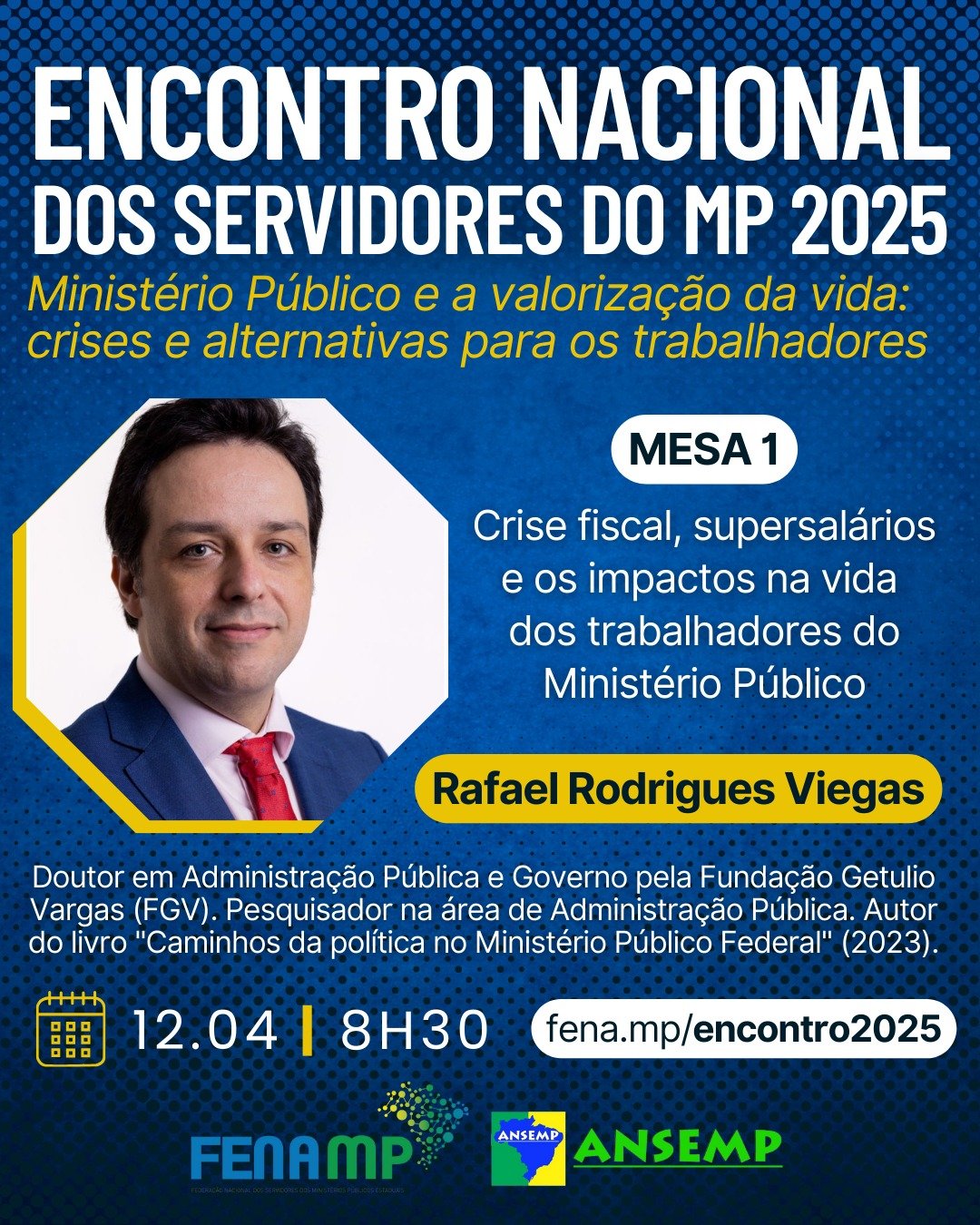 O Encontro Nacional dos Servidores do MP de 2025, promovido pela FENAMP e ANSEMP, iniciou seus debates no sábado, 12 de abril, em São Paulo. Com o tema “Crise fiscal, supersalários e os impactos na vida dos trabalhadores do Ministério Público”, o primeiro painel foi conduzido por Rafael Rodrigues Viegas, doutor em Administração Pública e Governo (FGV) e autor do livro Caminhos da política no Ministério Público Federal (2023).
