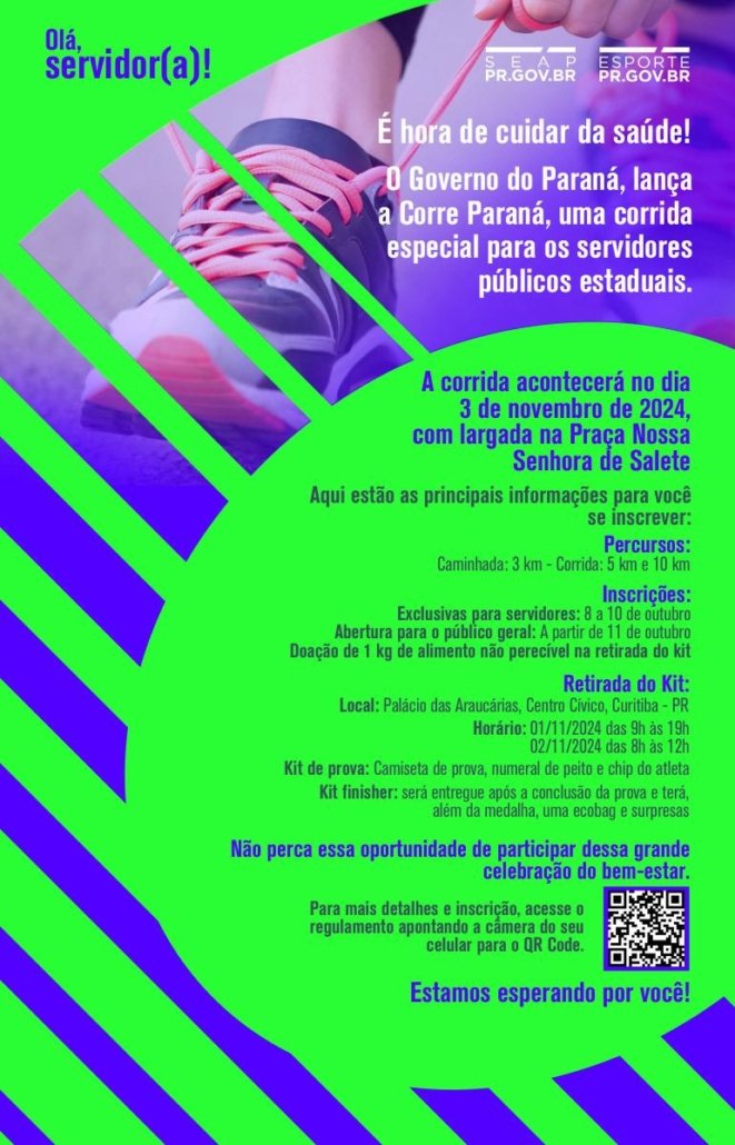 Fomos informados pela Secretaria da Administração e da Previdência (SEAP) e pela Secretaria de Esportes, os quais solicitaram a nós e ao MPPR que divulgássemos, sobre um evento inédito que farão no próximo mês: Corre Paraná 2024